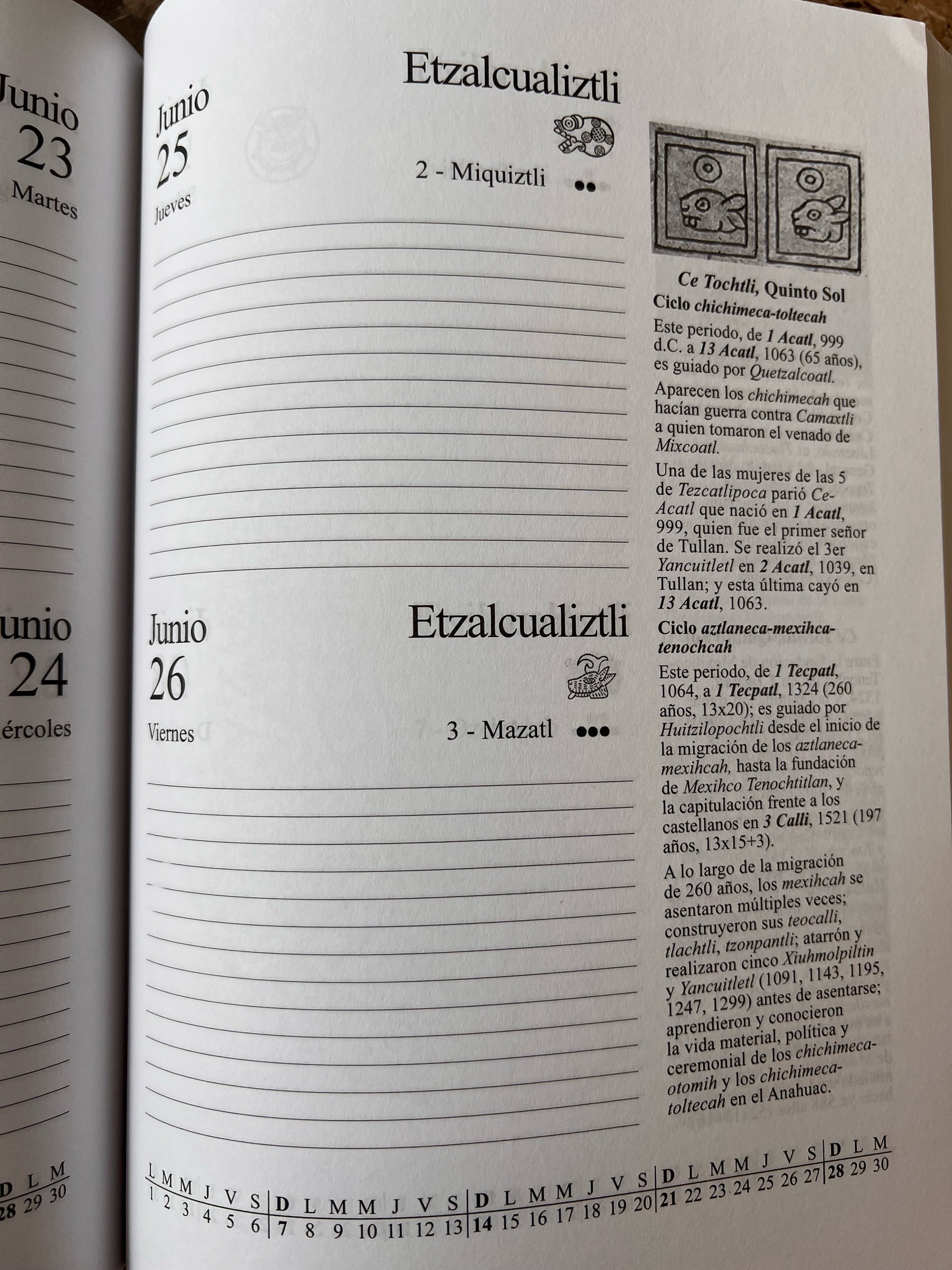 This planner have the name of the days in Nahuatl along with a short description of the day’s anniversaries. You will also find the moon phases.